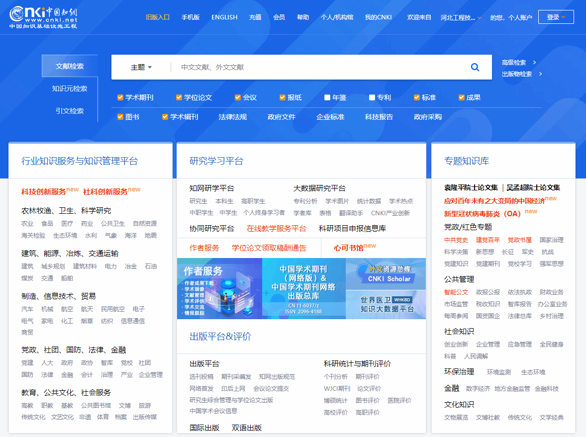 中国知网是国家知识基础设施工程,简称“CNKI”。“CNKI系列数据库”产品为一系列大规模集成整合传播我国期刊、博硕士学位论文、工具书、会议论文、报纸、年鉴、专利、标准、科技成果、古籍等各类文献资源的大型全文数据库和二次文献数据库,以及由文献内容挖掘产生的知识元数据库。