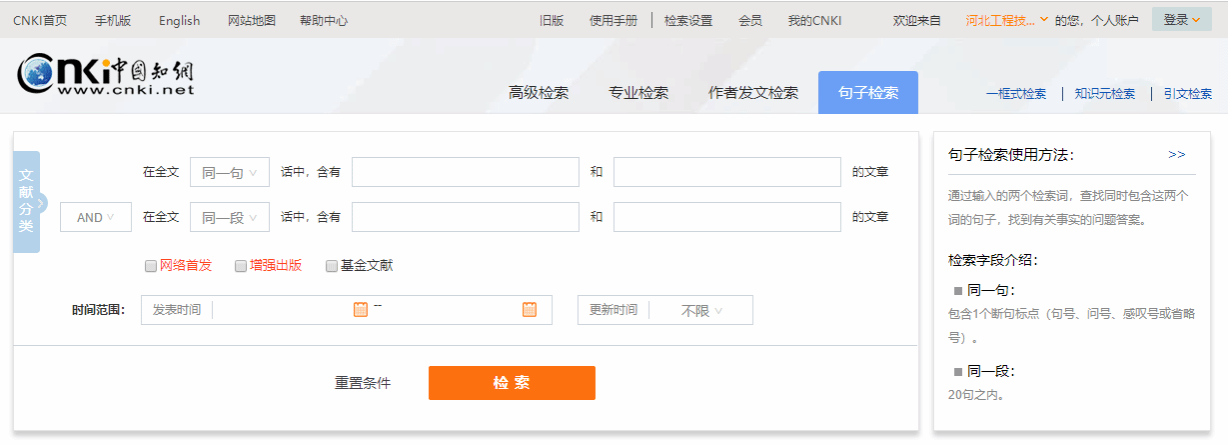 ⑤句子检索:检索在同一句话或同一段话中有检索词的文章。如下图所示: