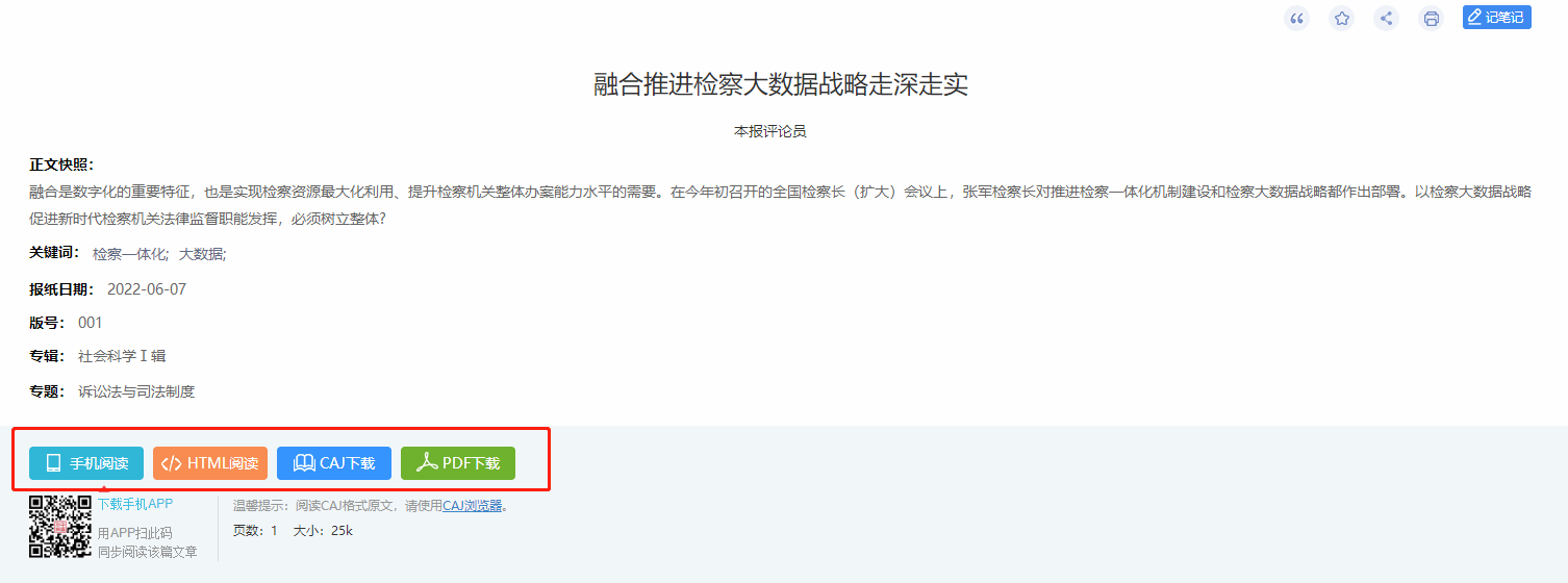 点击文章篇名,进入知网节页面,点击PDF、CAJ下载,亦可进行HTML在线阅读。同时可用手机APP全球学术快报扫描下方二维码同步至手机进行阅读。