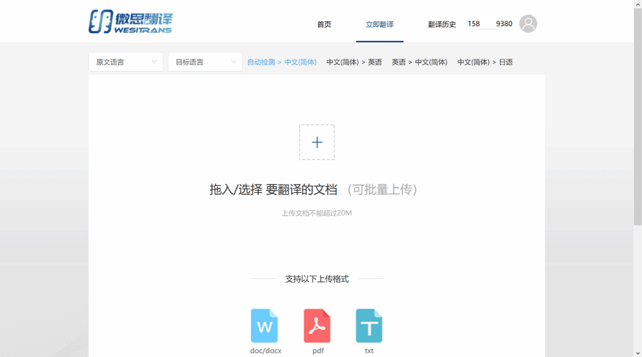点击标题栏“立即翻译”按钮,进入翻译页面,点击页面中的“+”选择添加翻译文件,跳转到“翻译历史”页面,可查看到各个文档的翻译情况。
