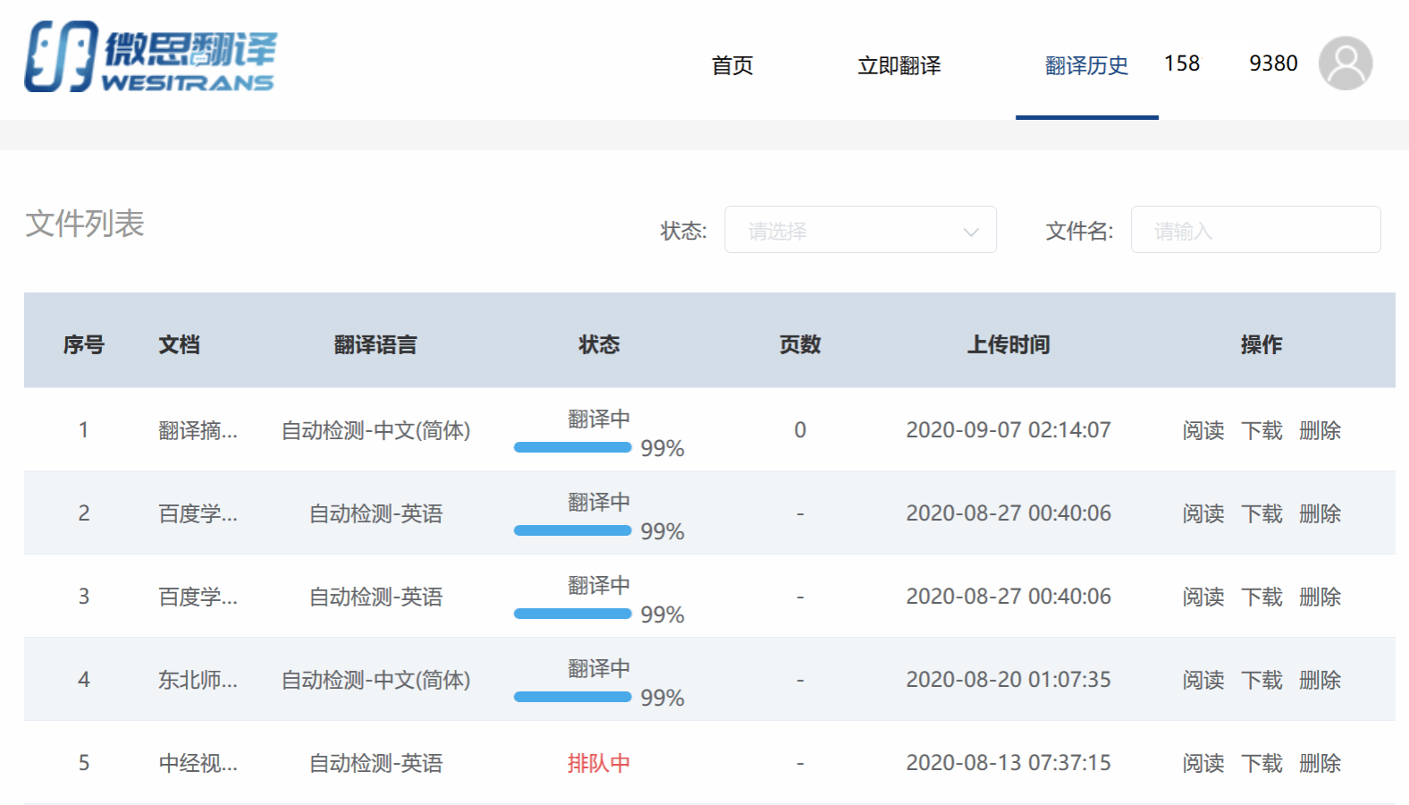 在翻译历史中,可以查看到各个文件的翻译情况,以进度条展示翻译进展,待翻译完成之后,可以选择在线“阅读”或者“下载”查阅。此外,还可以随时进行译文的删除。